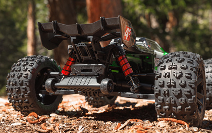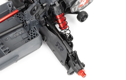 Long, aluminum-bodied, oil-filled shocks with silicone O-rings are mounted on high shock towers. These plus wide suspension arms give the KRATON 4S BLX the plush suspension travel needed to soak up bumps.