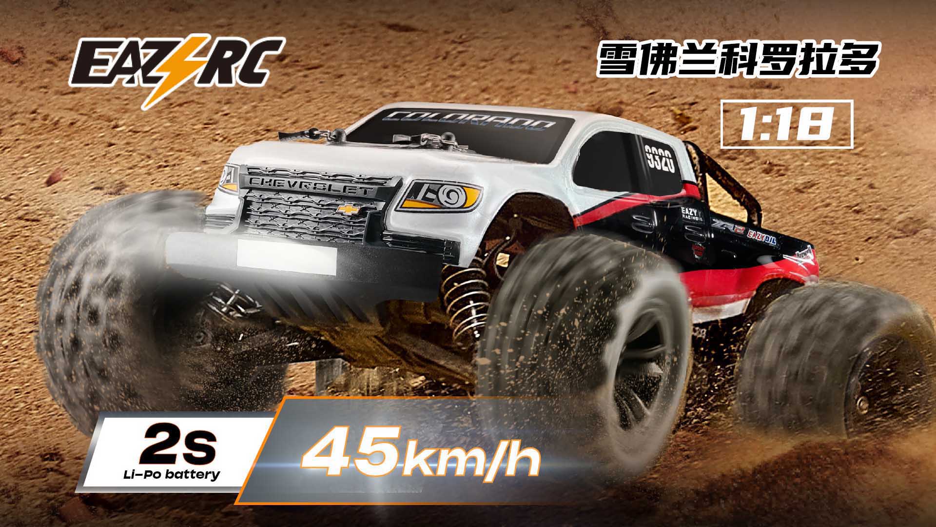 If you're looking for your first 1:18 RC monster truck, look no further than the EAZYRC 1:18 Chevrolet Colorado,licensed by General Motors LLC. 17g digital servo, 45A brushless ESC, 2S Li-Po battery, and a 4-pole high-torque brushless motor provide sufficient power for the full-time four-wheel drive system. The top speed reaches 45 km/h.