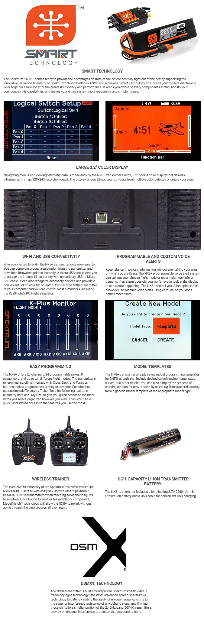 Spektrum NX8+ 2.4GHz DSMX 20-Channel Transmitter Features